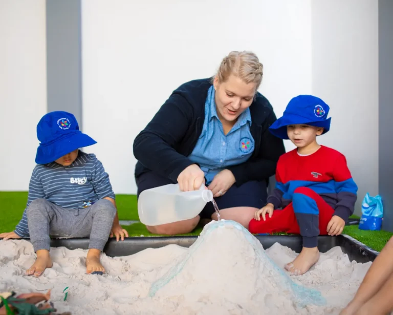 We set up simple play spaces where babies can safely explore. Toys are rotated often to keep things fresh and interesting. Childcare educators sit with the babies, guiding play and helping them focus on new things at their own pace.